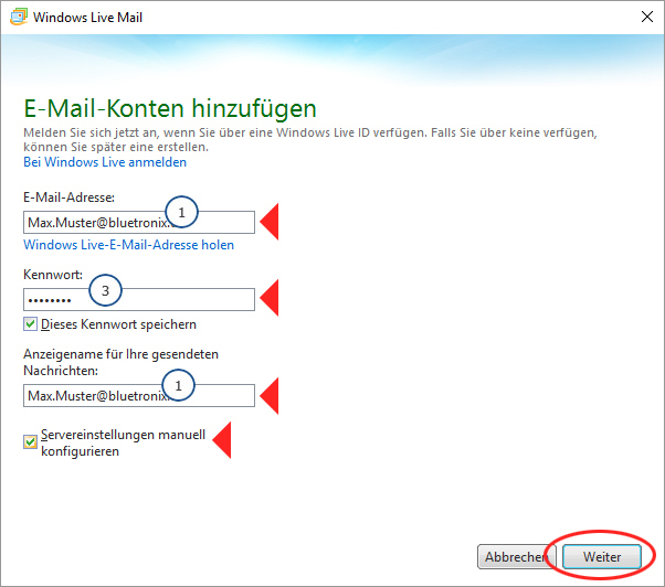 Füllen Sie die Felder "E-Mail-Adresse", "Kennwort" und "Anzeigename" mit den Daten aus Ihren Zugangsdaten 13